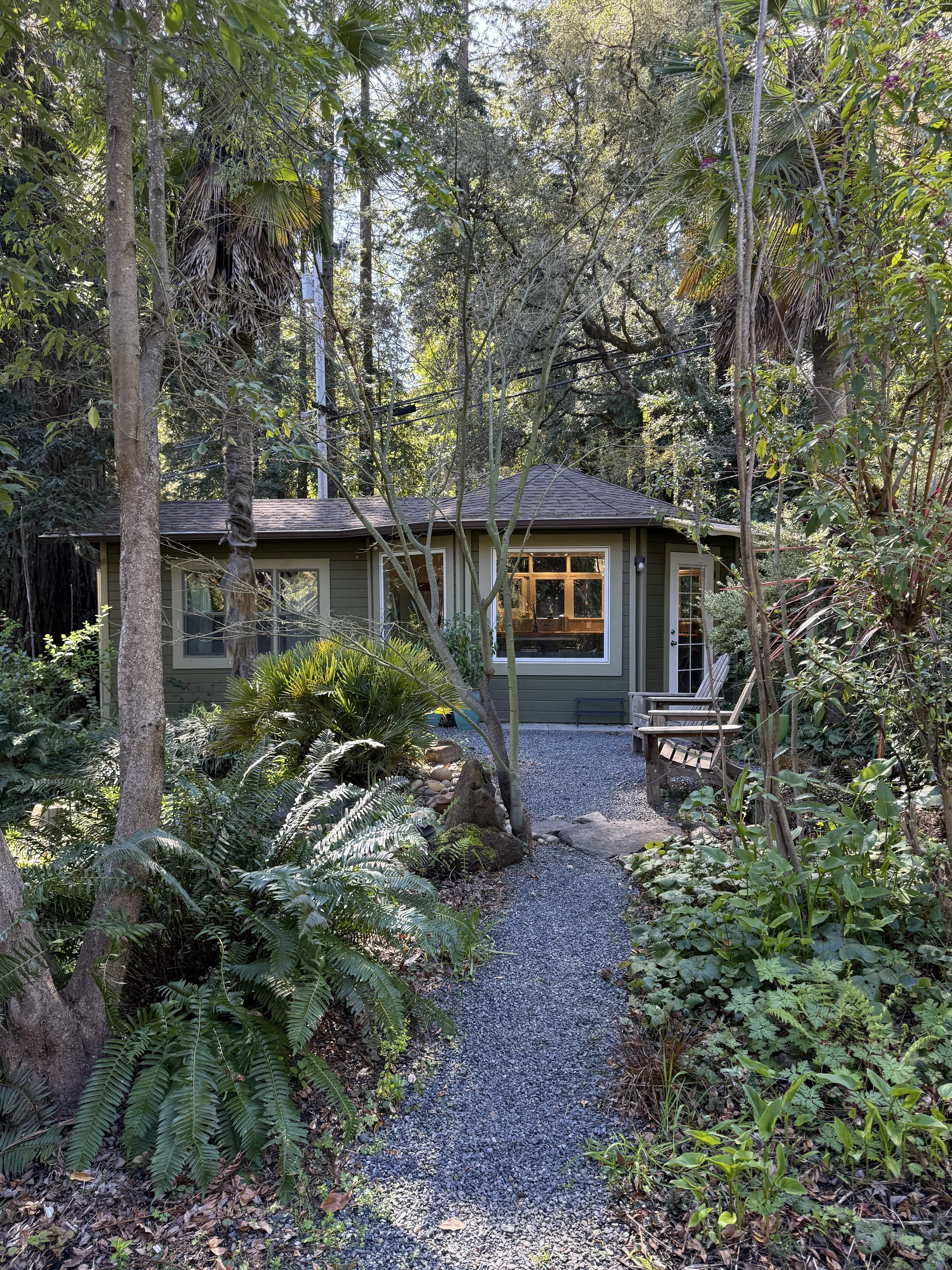 A 300-square-foot garden guest cottage on the WHG grounds. Queen bed in bedroom, bath with shower, living/dining/kitchen combo. Not suitable for wet work inside. (Up to two people. Perfect for a couple or solo.)
